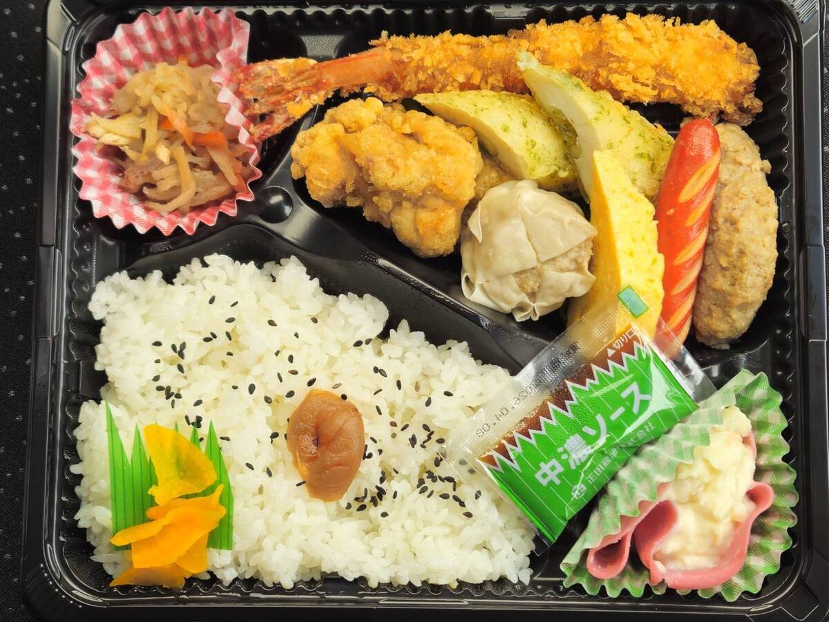 おかずはエビフライ、唐揚げ、磯部揚げ、ハンバーグ、シュウマイ、玉子焼き、ウインナーとかなり充実!