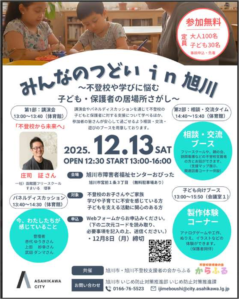 【12月13日】不登校や学びに悩む子ども・保護者の居場所探し/旭川市で開催