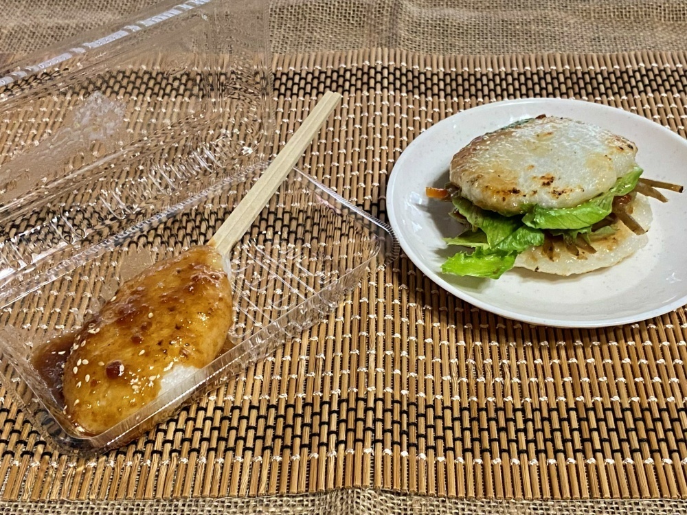 「なっちゃんメシ」は、いわゆる和風のライスバーガーでしょうか。肉やきんぴらごぼう、レタスをお餅で挟んでいてボリューム満点です。