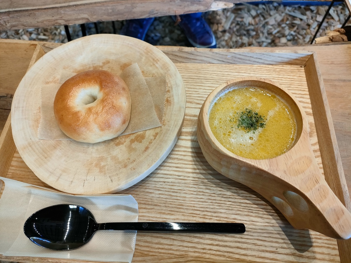 ベーグルと季節のスープ、写真には写っていませんがドリンクもついています。