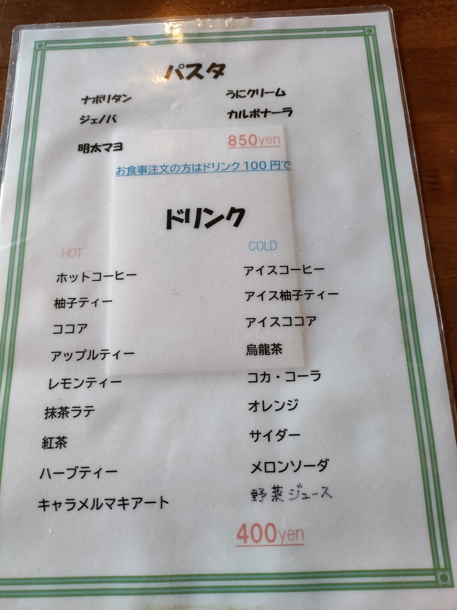 さらに、パスタを注文するとドリンクが100円なのは太っ腹ですね!