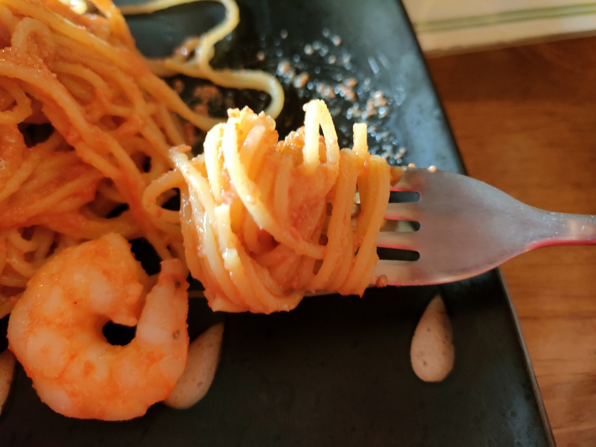 細麺のパスタに、ピリリと辛い明太子がしっかり絡んで、パンチの効いた美味しさ!