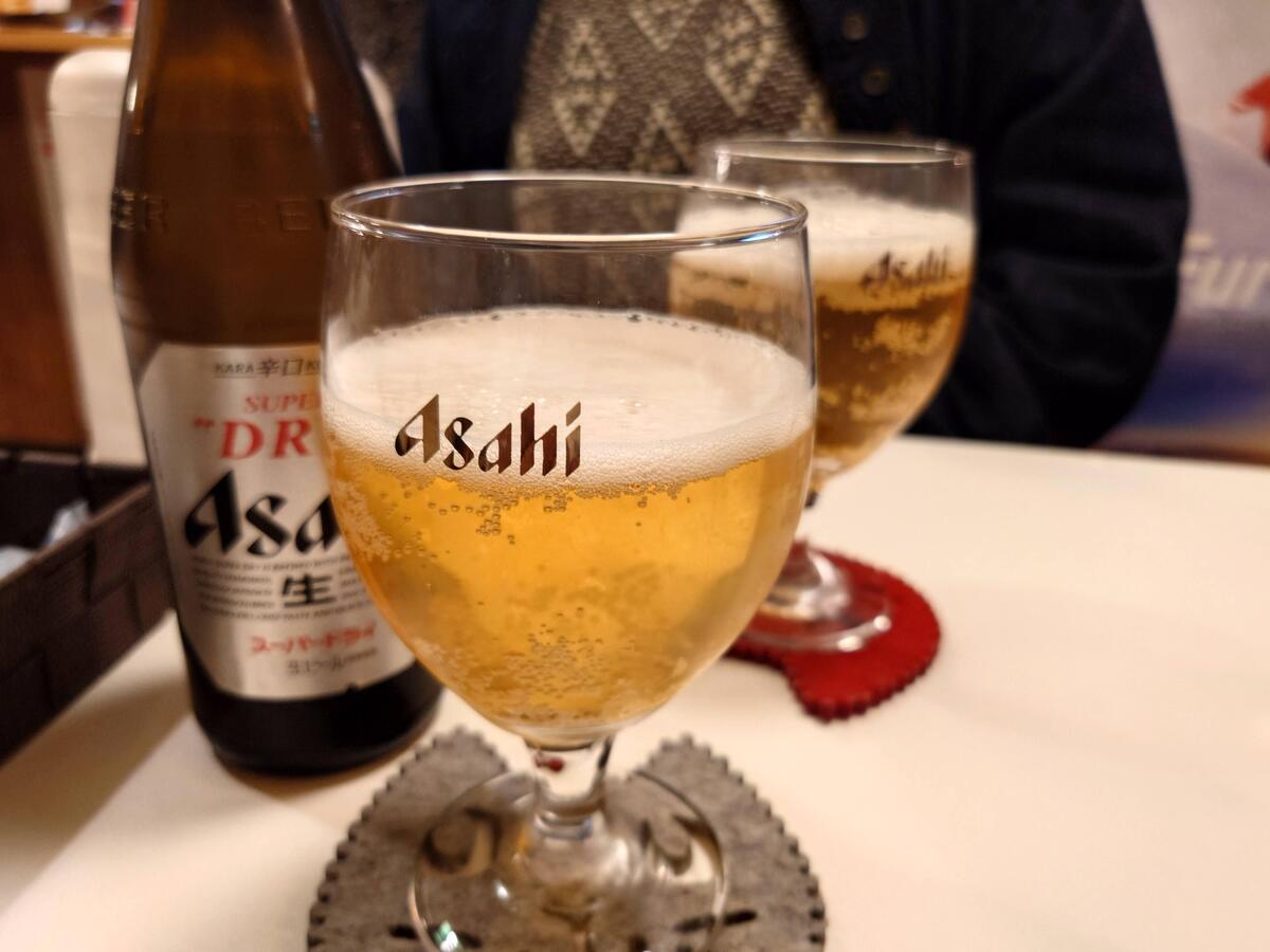 アサヒの瓶ビール♪グラスがカワイイ。650円。
