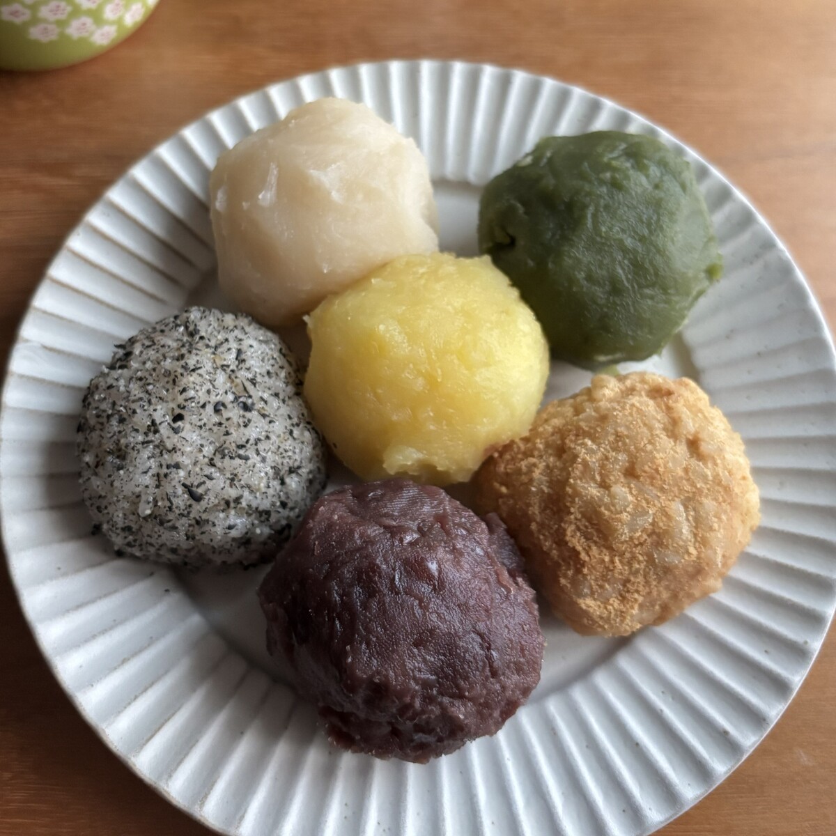 つぶあん、栗、白あん、きなこ、ごま、抹茶。