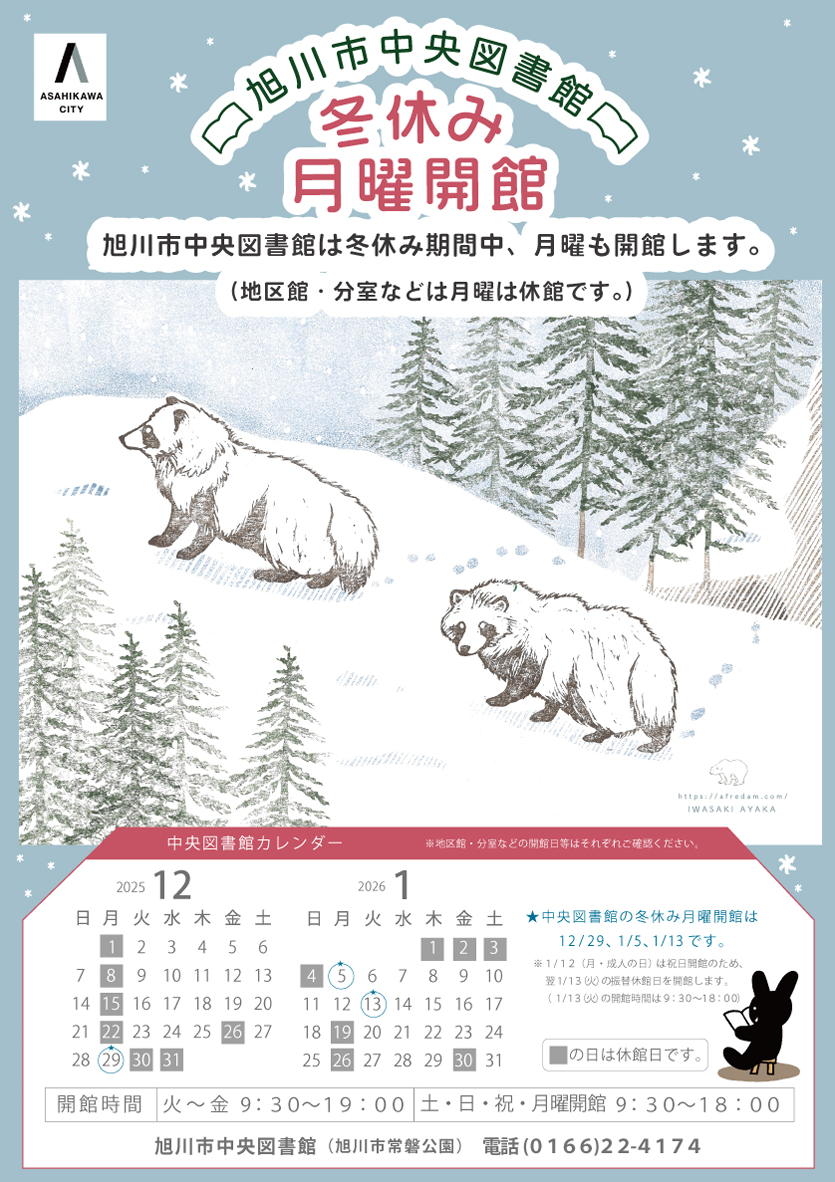 旭川市中央図書館は2025年12月、2026年1月の冬休み期間中、月曜も開館します。