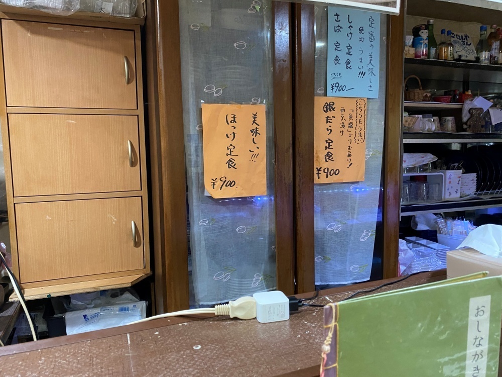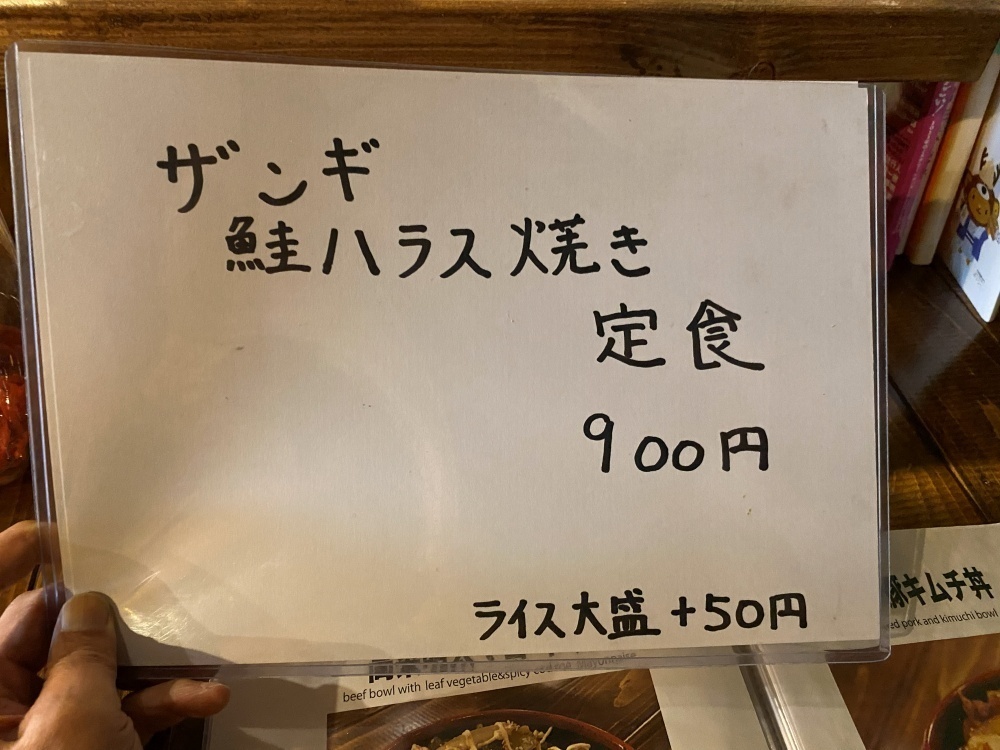 さて、どの丼ものを食べようかとお品書きを眺めていたら、目の前に「ザンギ・鮭ハラス焼き定食」と手書きでかかれたメニューがあるではないですか。
