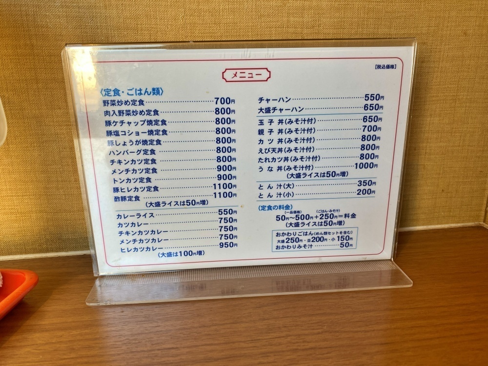 メニュー表には野菜炒め定食やハンバーグ定食などの定食類、カレーライス、チャーハンなど豊富な料理が並んでいます。
