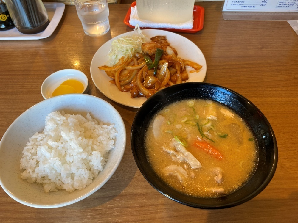 この日は、お店の方のおすすめで「豚ケチャップ焼定食」を注文。そしてお味噌汁をとん汁(大)に変更しました。