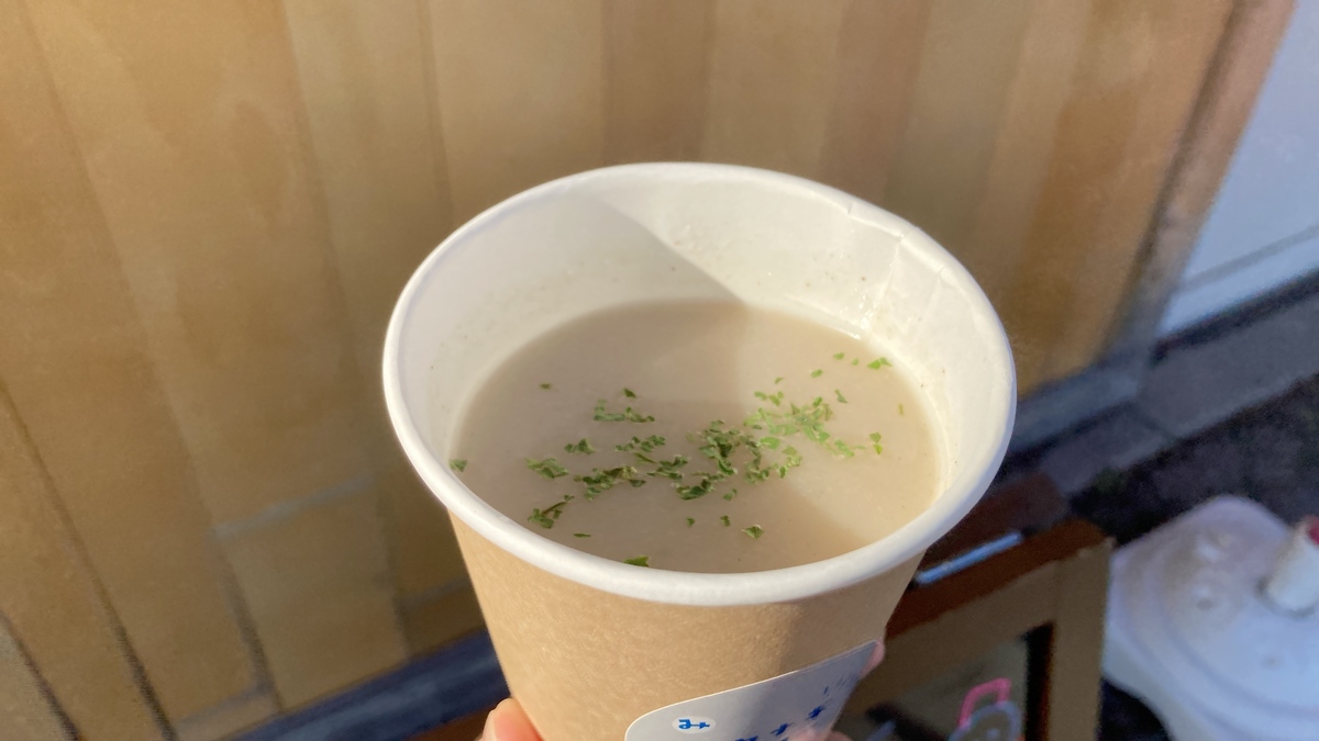スープにはちゃんとクルトンがトッピングされており、大きな具はないためスプーンがなくても片手で飲みやすいのが嬉しいポイントです。