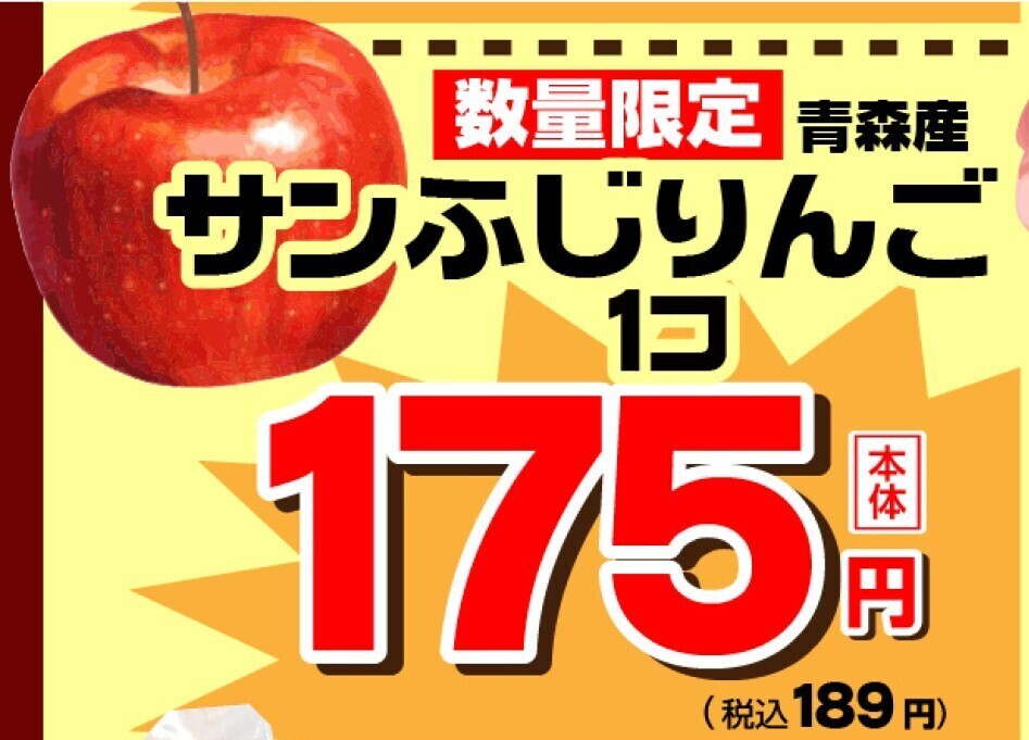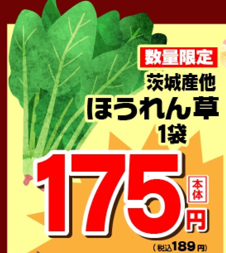 茨城産のほうれん草、青森産サンふじりんごどちらも税込189円のお買得価格です!