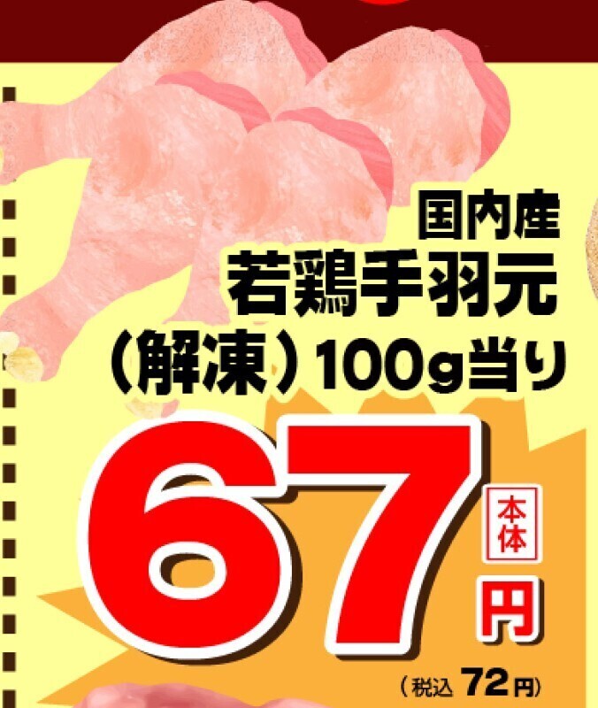 『毎日の献立を助ける』国内産若鶏手羽元肉が、なんと100g当り税込72円!