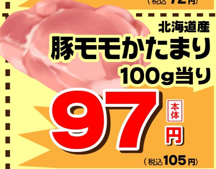 惜しみなく使える北海道産豚モモかたまりが税込105円!