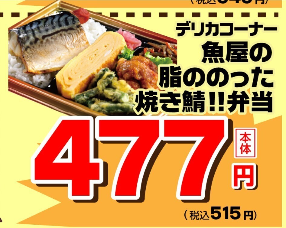 デリカコーナー大人気企画の魚屋の脂ののった焼き鯖弁当が税込価格515円!
