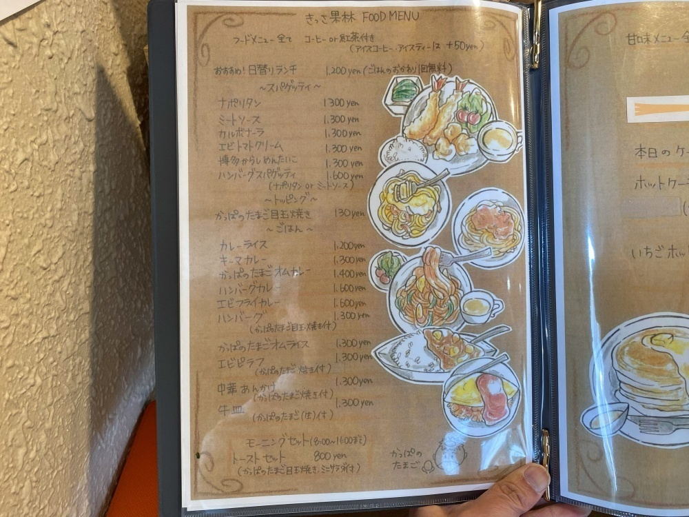 フードメニューは、スパゲッティやカレー、ハンバーグ、ピラフ、ホットケーキなどかなり豊富。11時からは日替わりランチもあります。