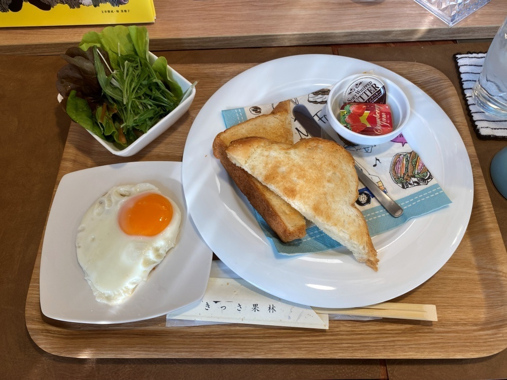 「モーニングセット」は、トーストと目玉焼き、ミニサラダ、ドリンク(コーヒーまたは紅茶)が付いています。