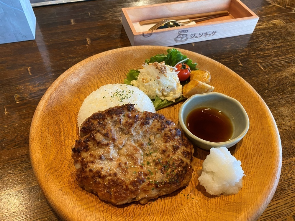 粗挽き肉のハンバーグで、しっかりと肉の旨みが味わえます。ソースは和風で大根おろしが添えられているので、さっぱりと頂けます。