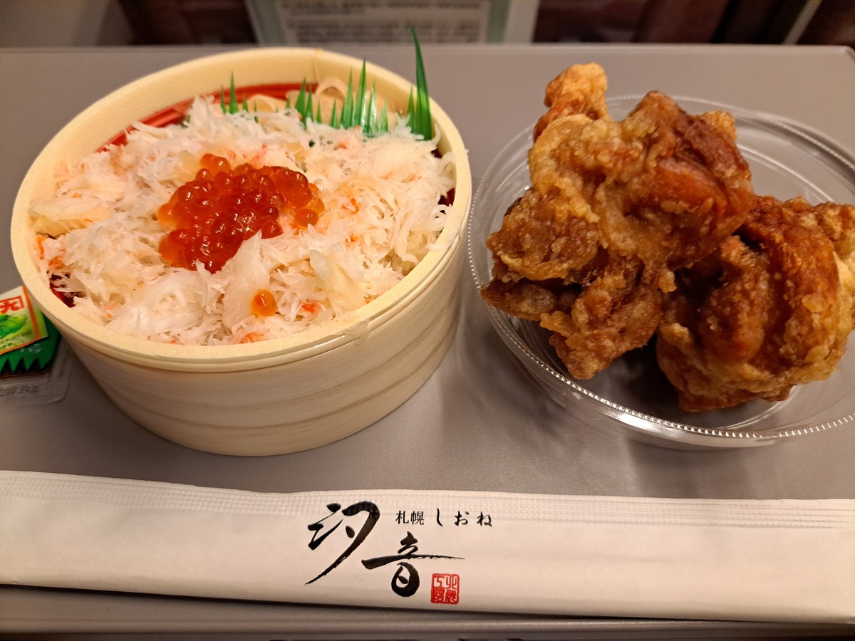 汽車の中で「汐音のカニ丼」と「若鶏時代なるとのざんぎ」を堪能!!
