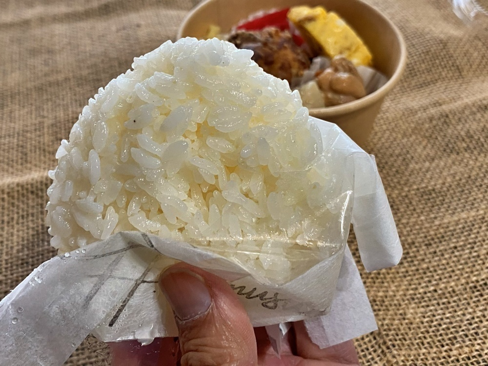 購入したのは、「 塩むすび 250円」と「おかずセット(肉) 400円」です。
