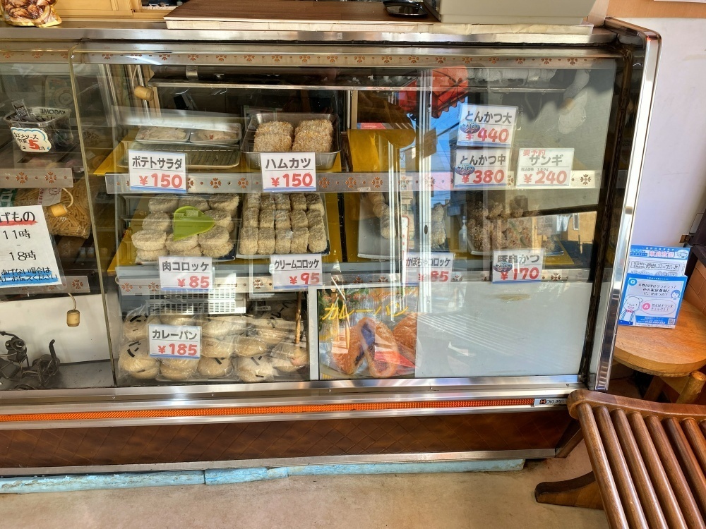 店内のショーケースの中には、ハムカツや肉コロッケ、クリームコロッケ、かぼちゃコロッケ、豚串かつ、カレーパンなどが並んでいて、注文するとその場で揚げてくれます。
