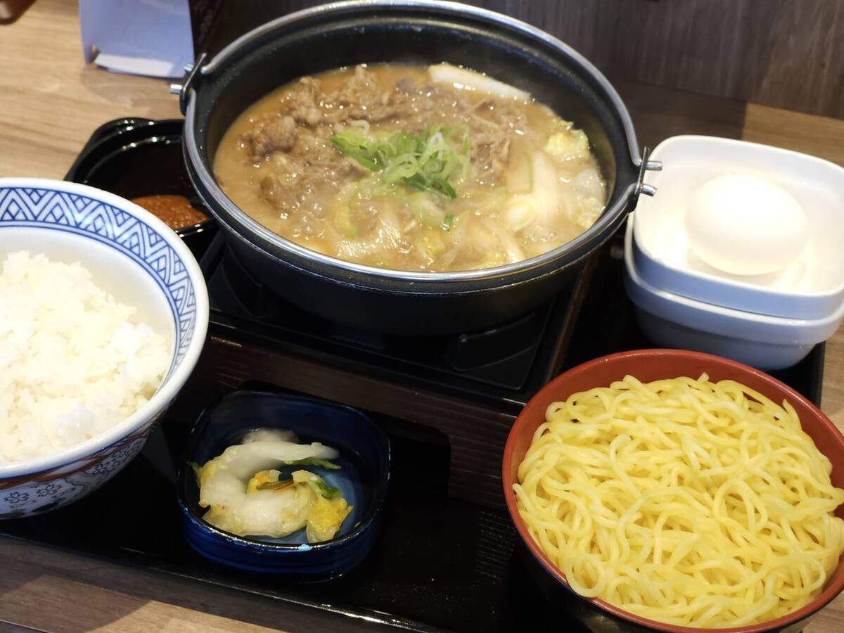 メインの鍋にごはん、麺、生卵、漬物がセット。