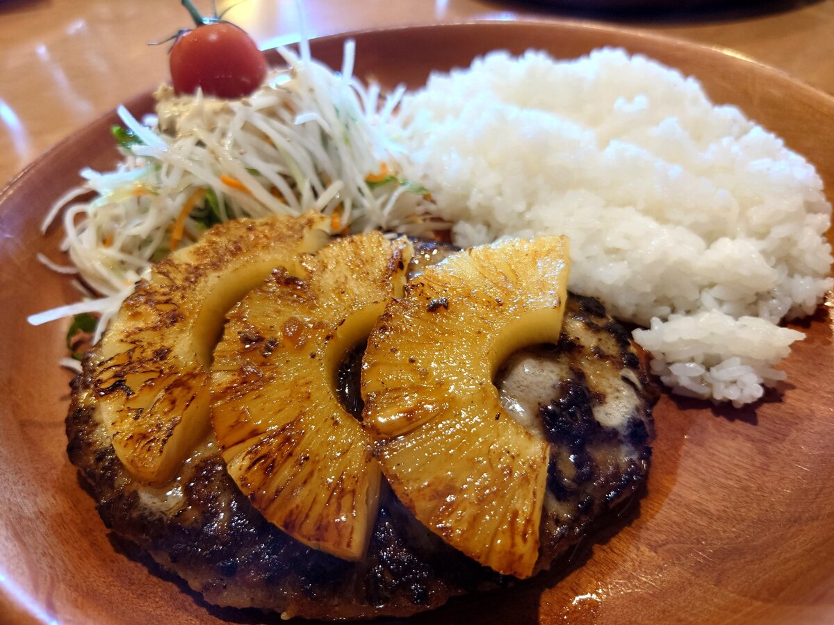 甘酸っぱいパインが旨味と肉汁たっぷりのハンバーグに合わさってライスがすすむ。