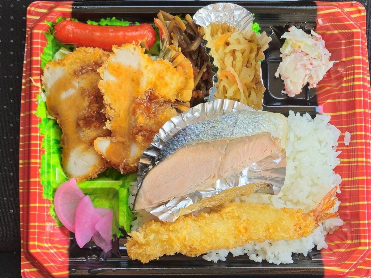 チキンカツ、エビフライ、焼き鮭のほか副菜もたっぷり。