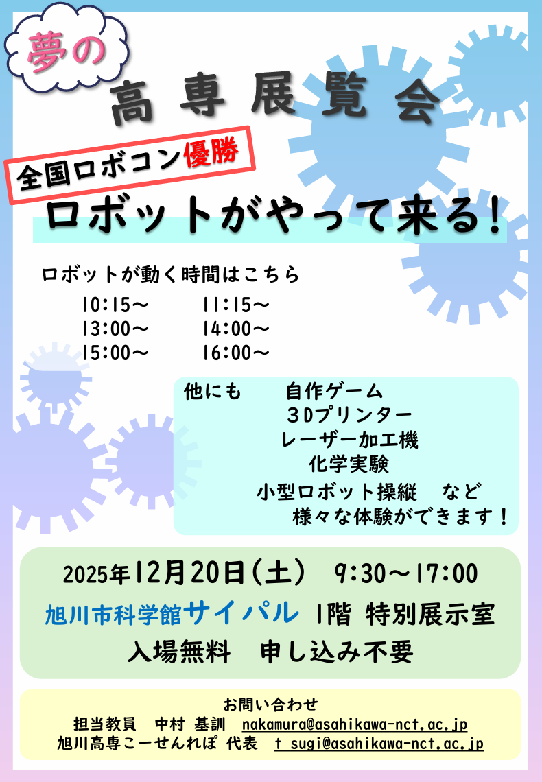 2025年12月20日(土)に旭川市科学館サイパルで『夢の高専展覧会 全国ロボコン優勝ロボットがサイパルにやって来る!』が開催されます。