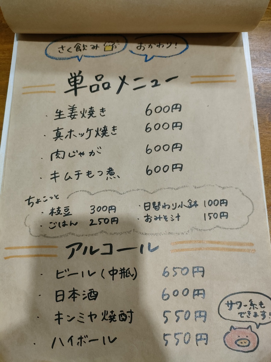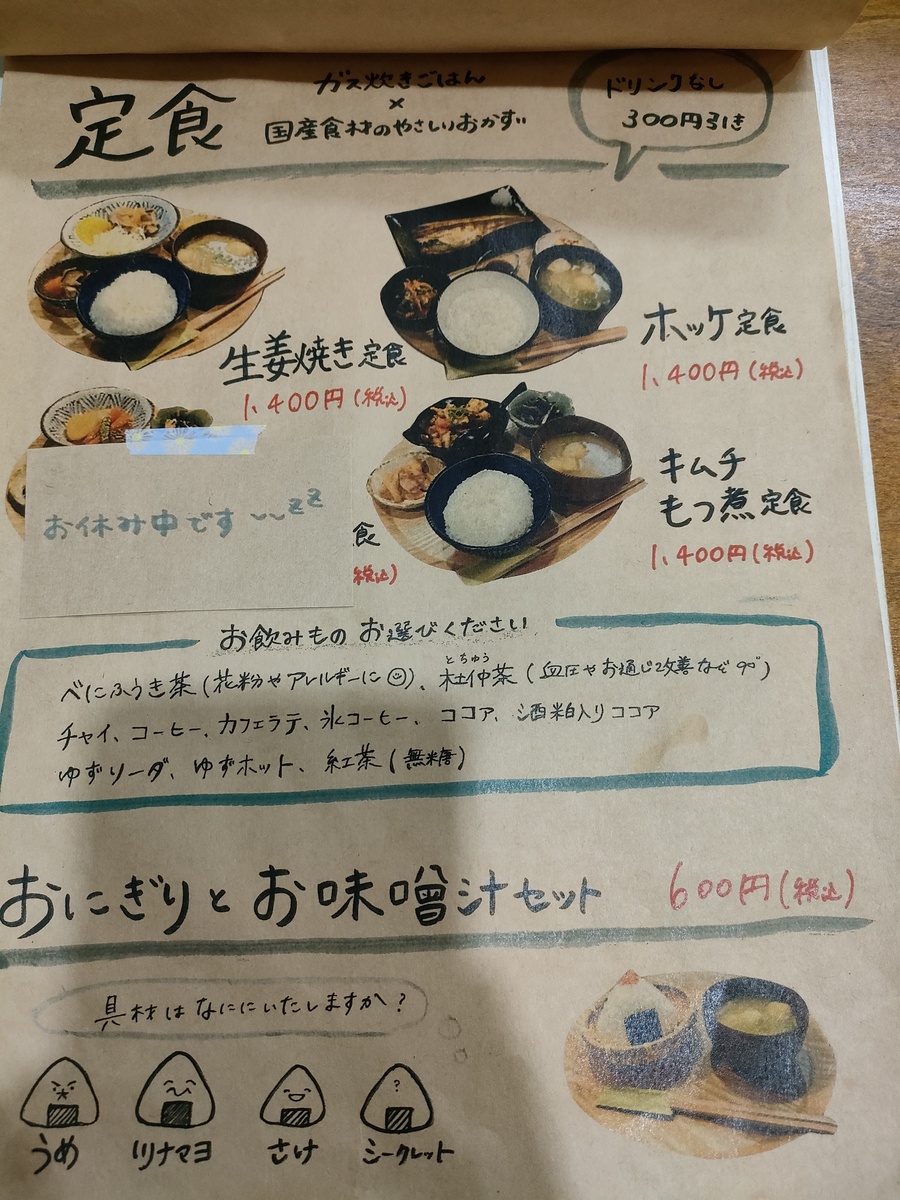 メニューは定食やおにぎりとお味噌汁のセット、カレーのほか、おかずの単品メニューとアルコールでちょい飲みまで出来るんですね!
