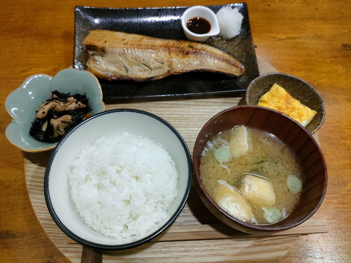 焼きホッケにご飯、味噌汁、ひじきの煮物、玉子焼きが付いて、お値段1,400円。