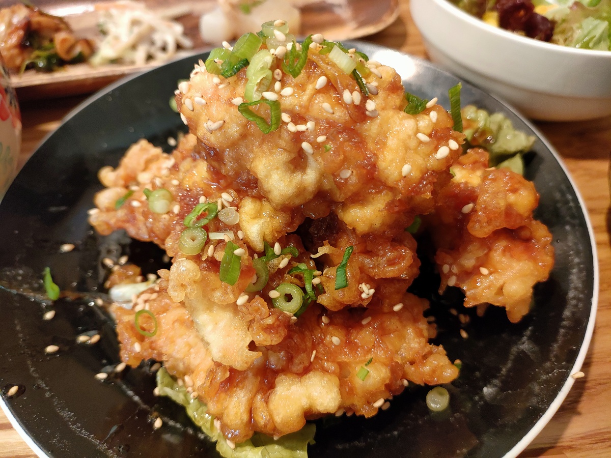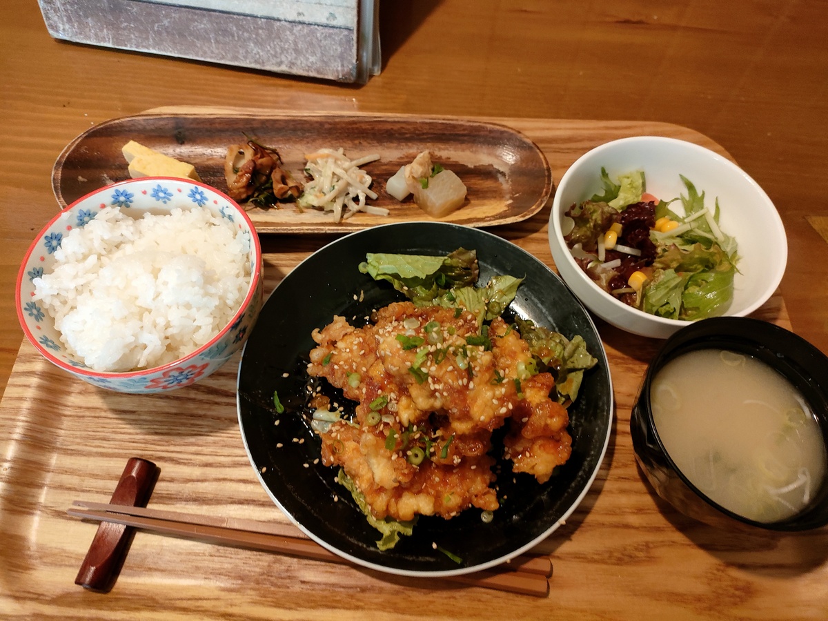 唐揚げは甘酢ダレのようなものがかかっており、ご飯がどんどん進むパンチの効いた味わいです。