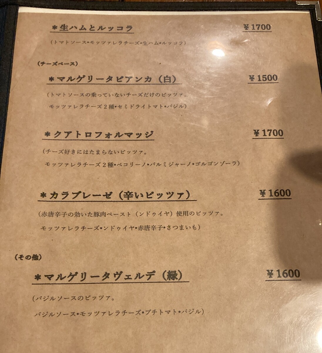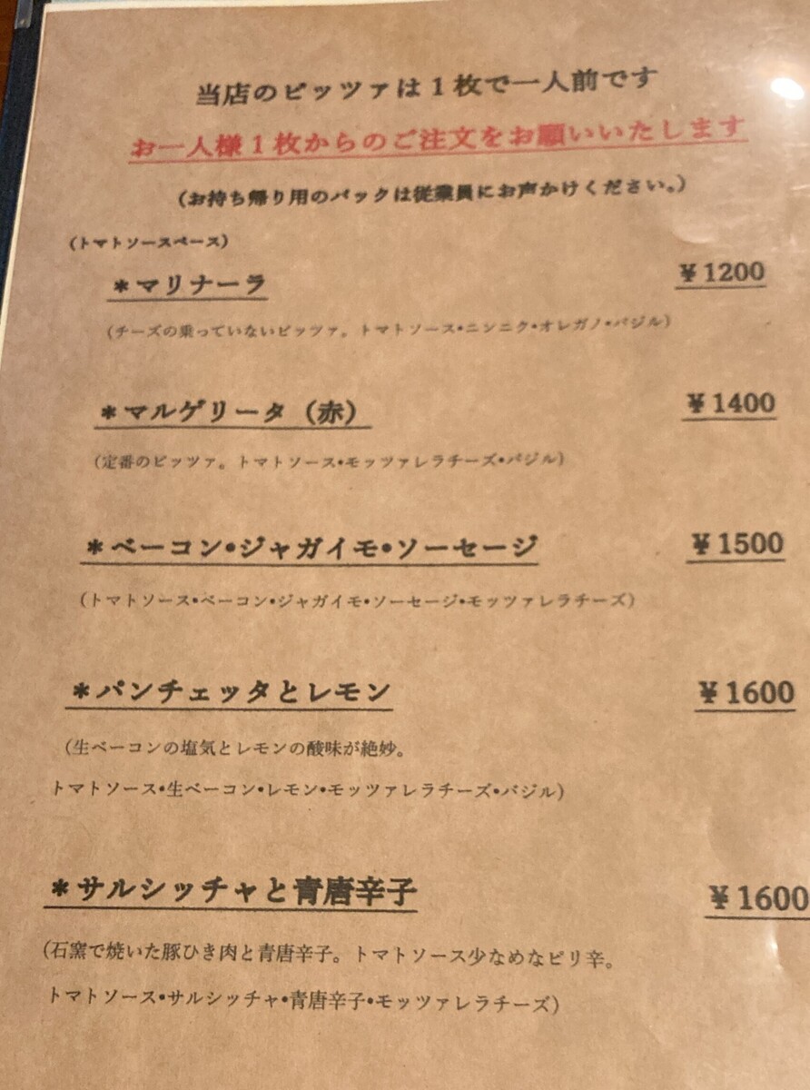 ピッツアは1200円~1700円で、1人1枚注文制。