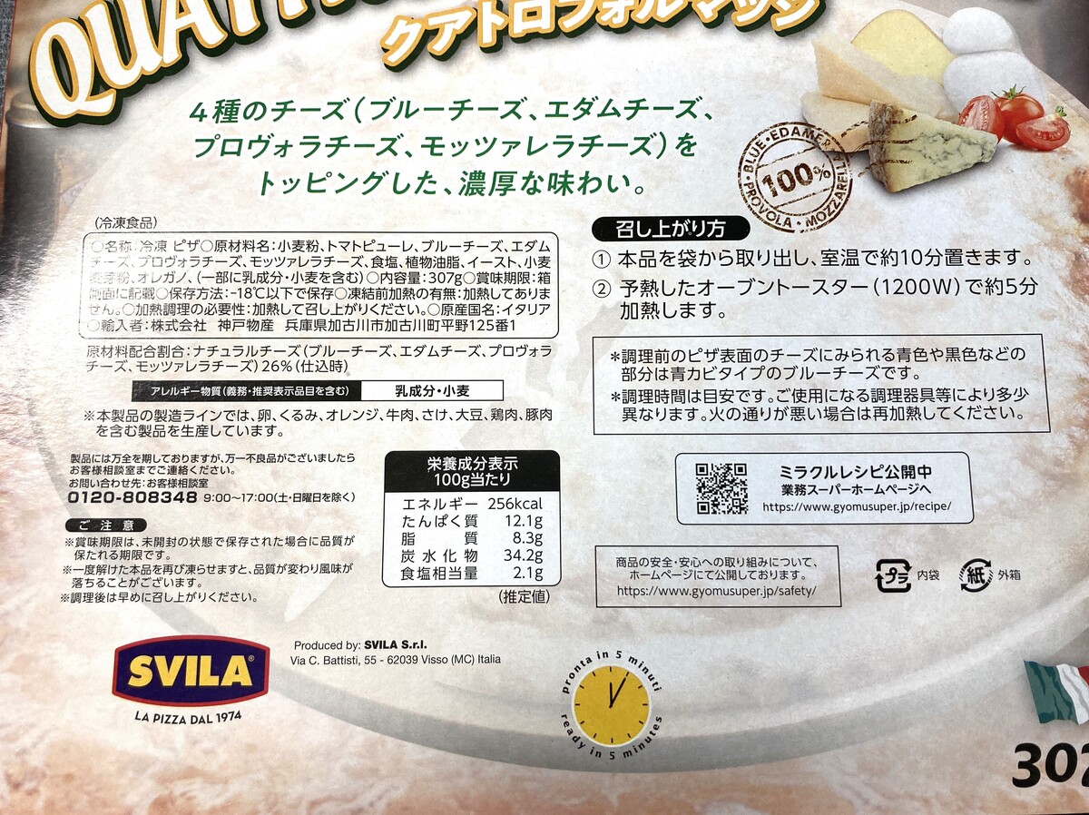 ブルーチーズ・エダムチーズ・プロヴォラチーズ・モッツァレラチーズの4種類のチーズを使用した、イタリア直輸入の商品です。