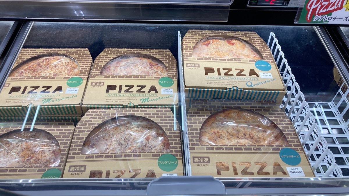 宅配ピザのようなしっかりとした箱に入った冷凍ピザです。ミックスピザ、マルゲリータ、クアトロチーズなどが並んでいました。