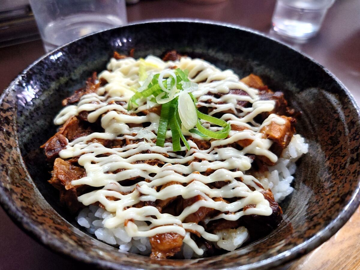 サイコロ状にカットされたチャーシューは、味がしっかり染み込んでいて、マヨとの相性もバツグン。