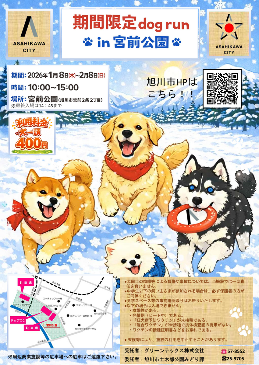 2026年1月8日(木)から9月30日(火)まで、旭川市の宮前公園内で開催される『期間限定dog run in宮前公園』のご紹介です。