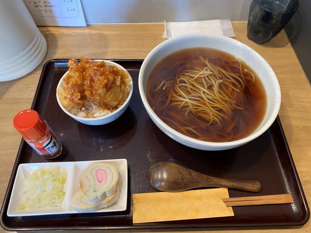 この日は、寒かったので温かい「かけそば」。合わせて「一口鳥天丼」も注文しました。