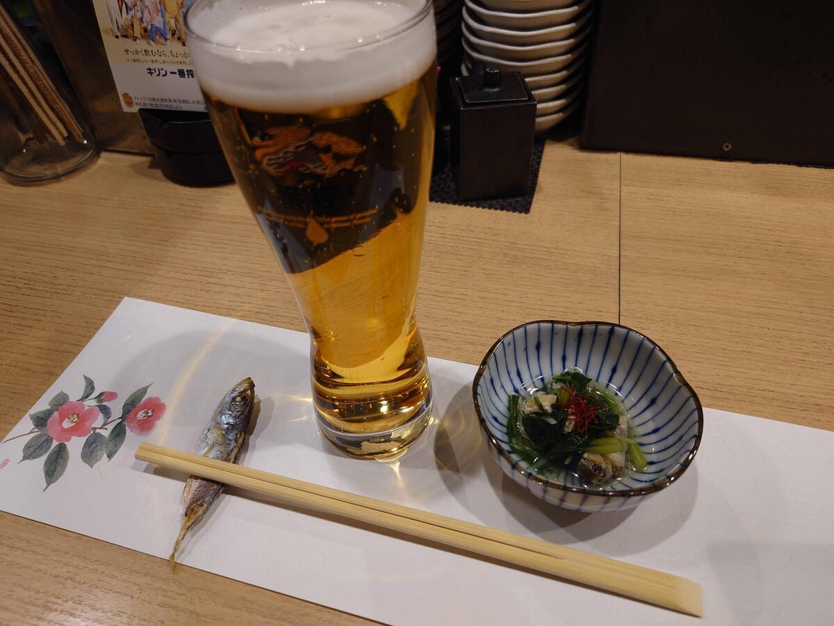 キリン一番搾り(600円)とお通し。