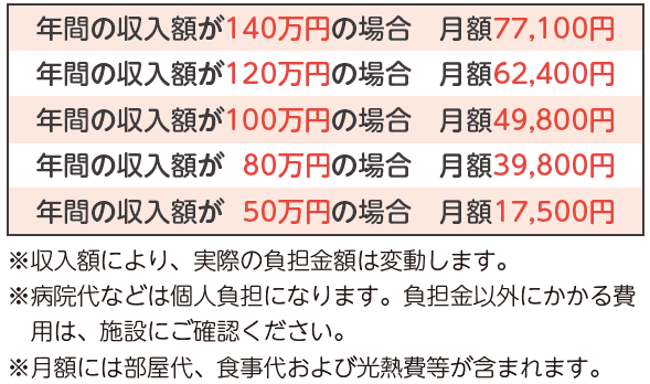 ⇒収入に応じた費用負担となるため、収入が少ない方でも入所可能です