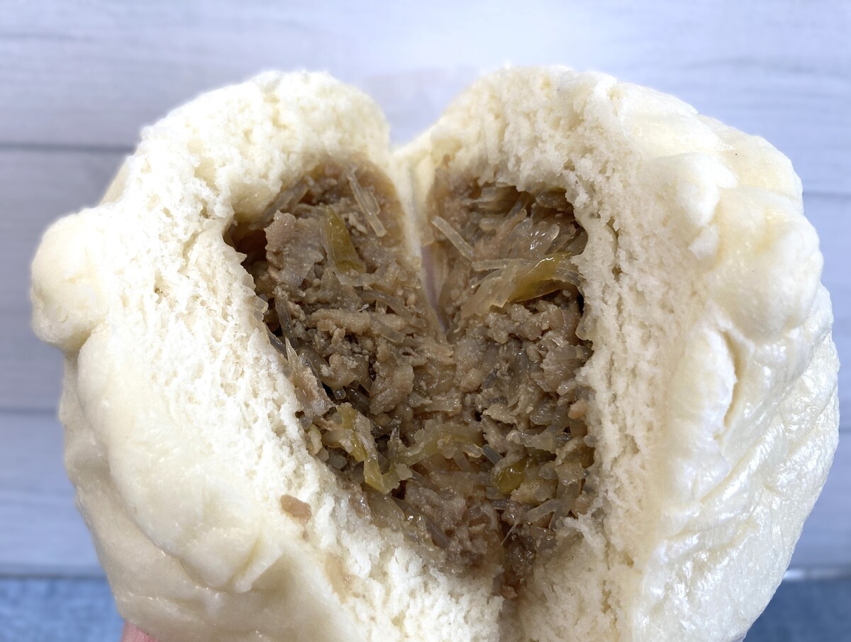 家に持ち帰って食べてみると、豚すき焼きまんは甘辛いひき肉とはるさめがたっぷりで、皮はもちもちふんわり。