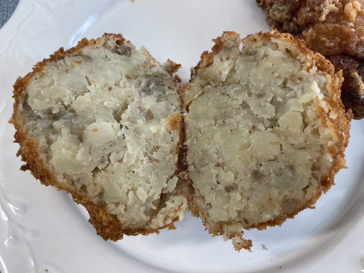肉じゃがコロッケはしっかり味が付いていてソースいらず。ホクホクのじゃがいもが美味しい一品です。