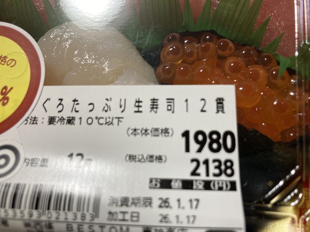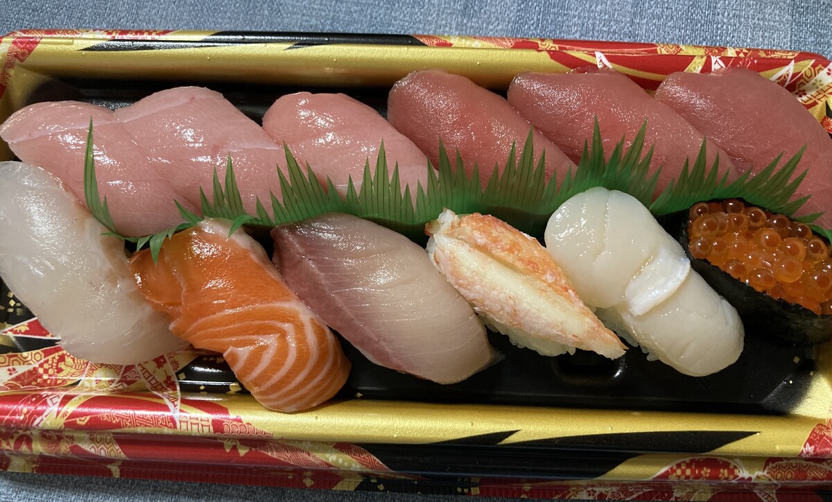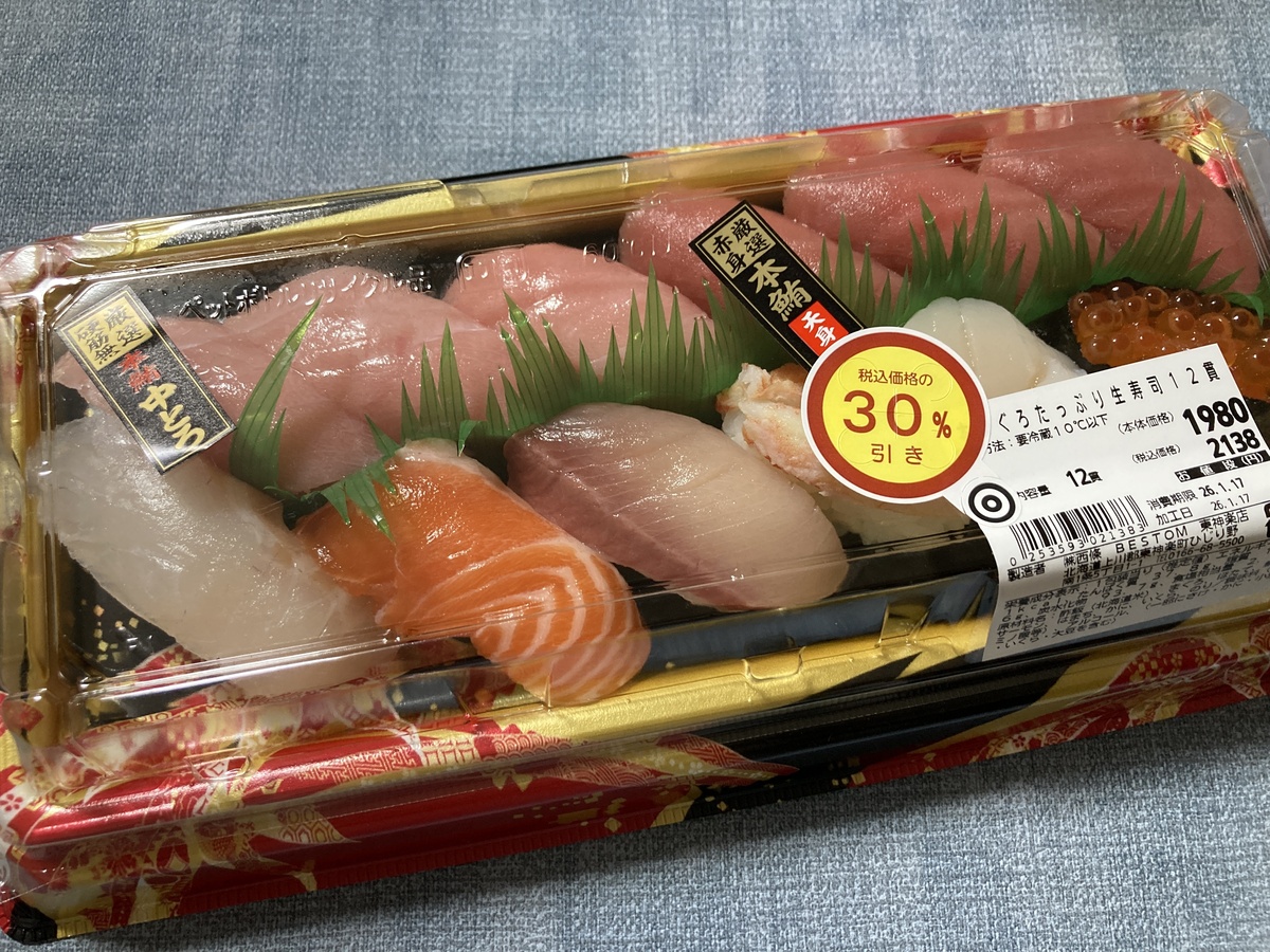 今回購入したのは、旭川のお隣、東神楽町のスーパーベストム東神楽店の「まぐろたっぷり生寿司12貫」。30%引きで手に入れたのですが、ネタの鮮度とボリュームにびっくり。これがスーパーで買えるのも、北海道ならではの魅力です。