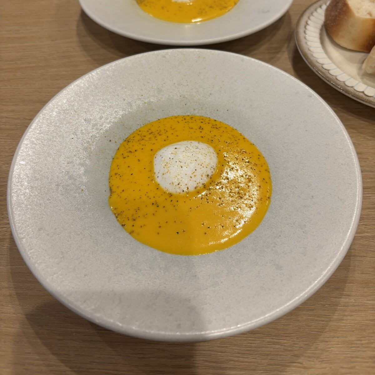 やさしい甘さが広がるかぼちゃのポタージュ。 ひと口飲むと、かぼちゃ本来の甘みとミルクのコクがふわっと広がり、体の芯からほっと温まる味わい。とろりとした口当たりなのに重すぎず、 「今日の疲れが溶けていく…」と思わせてくれる、癒しの一杯です。