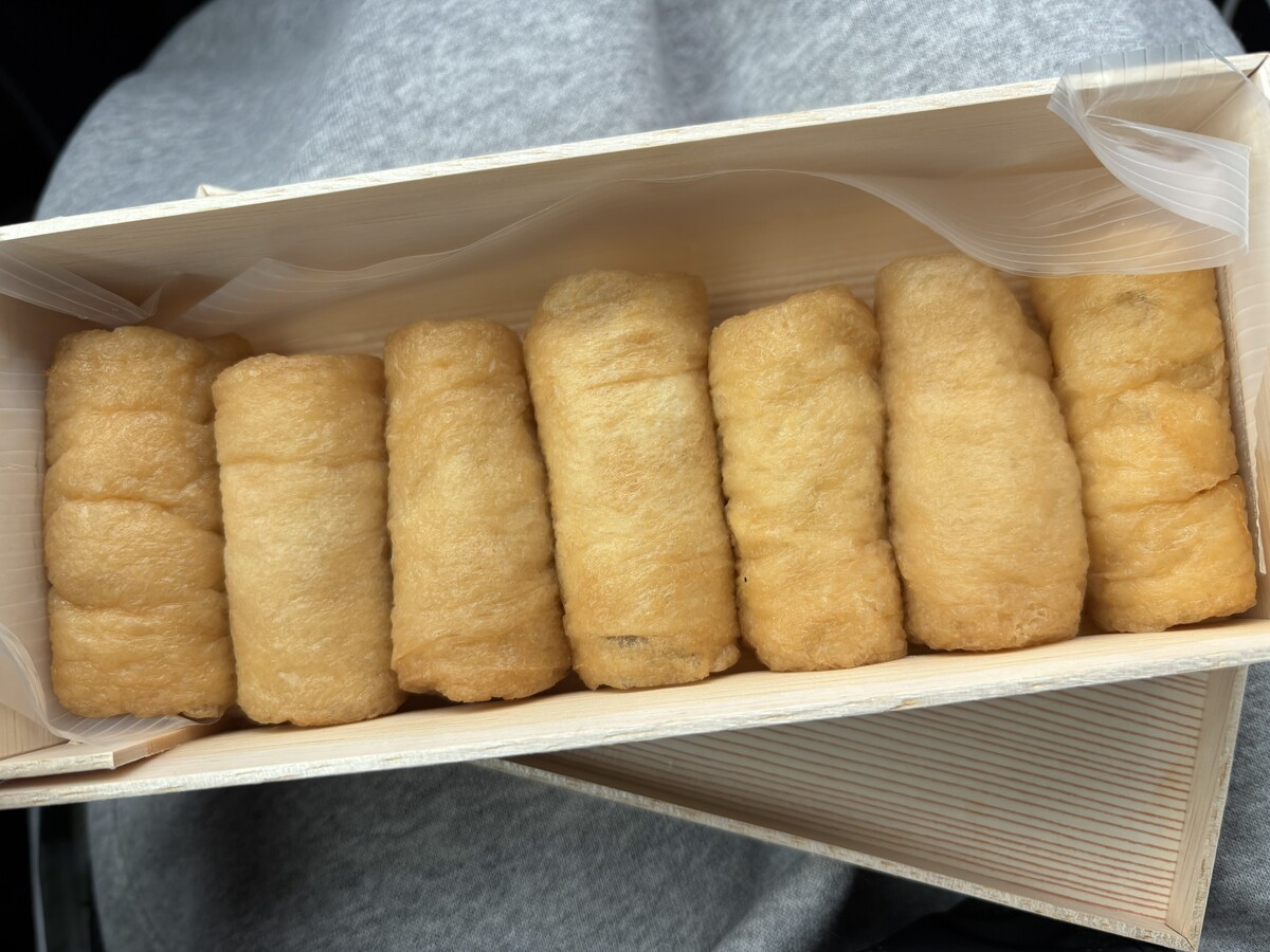 一枚の小揚げに酢飯が巻かれているので、中々見たことがない感じのお稲荷さんですね。