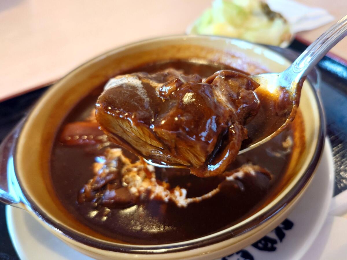 ホロホロに煮込まれた牛たんが、超濃厚なデミグラスソースに溶け込んでる。