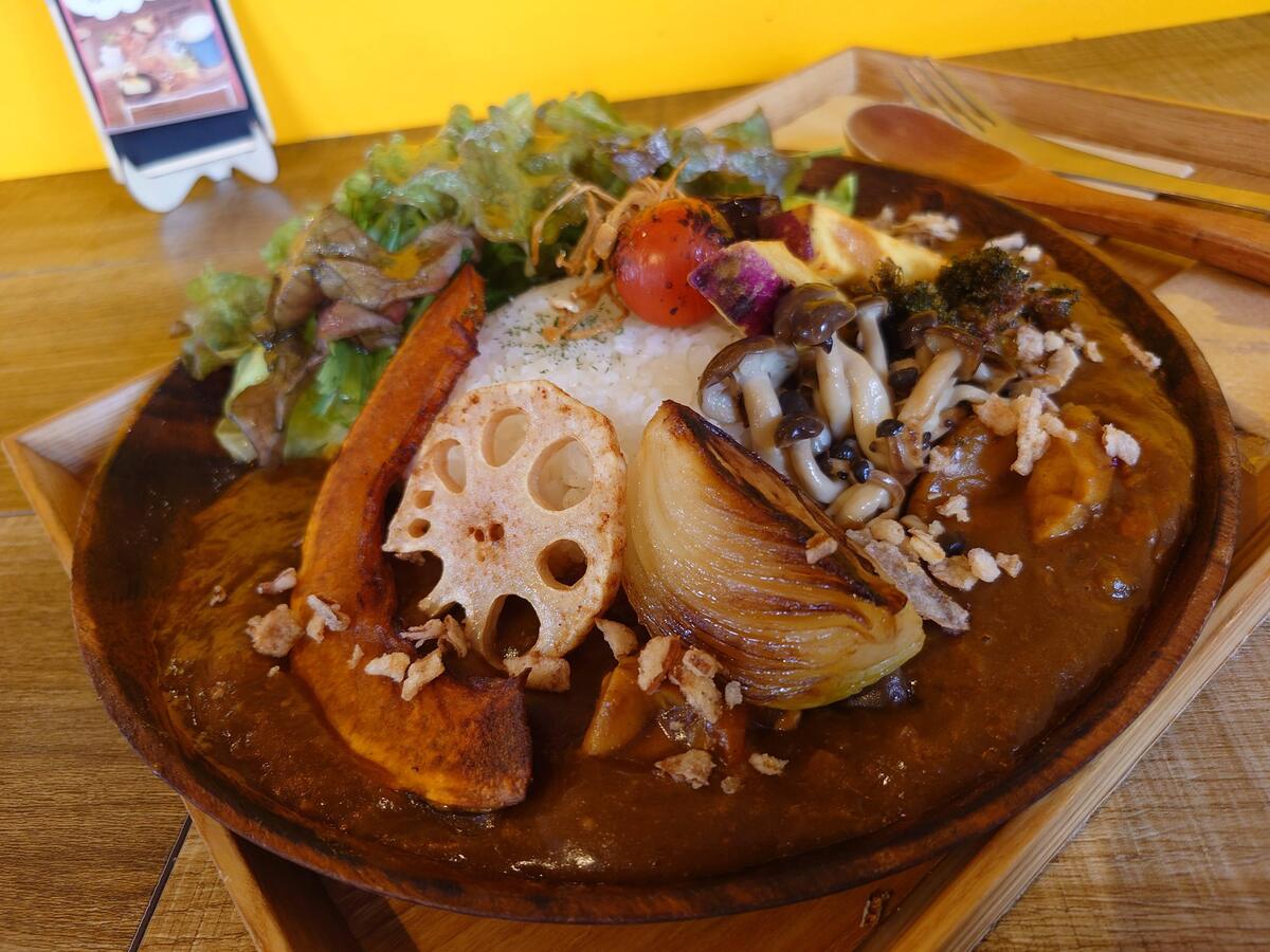 素揚げやローストで仕上げた野菜は、それぞれ食感も味わいも違い、スパイスの効いたカレーとの相性もよく最後まで飽きずに楽しめる。