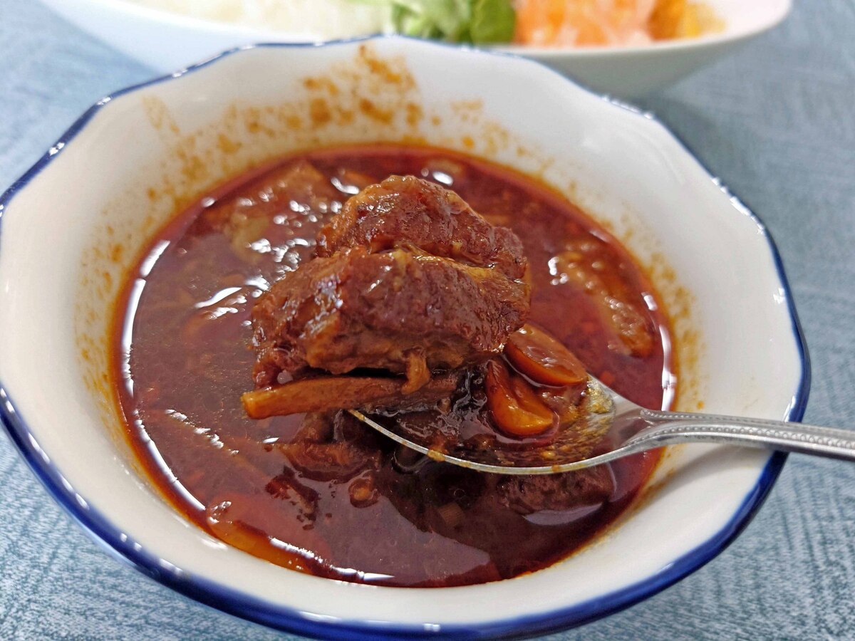 味わいと酸味のバランスが絶妙で、しっかり煮込まれた豚肉がゴロッと入っています。