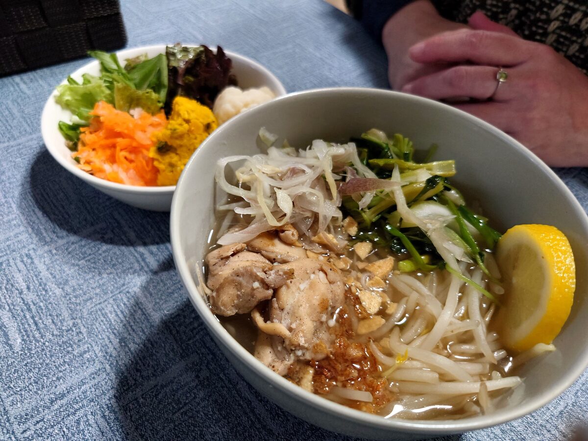 平打ちの米麺にチキンスープがあっさりしてて、実に合う。