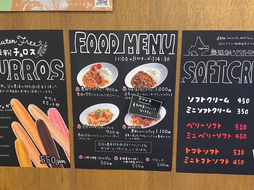 カフェには、カレーやパスタなどのフードメニューの他、米粉のチュロスやフリッツ、ソフトクリーム、甘酒などもあります。