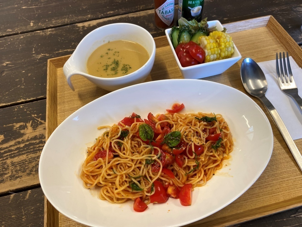 「農場のトマトカレー」は、これまで何度か頂いたことがあるので、この日は「完熟トマトの冷やしパスタ900円(2025年9月時点)」を注文しました。