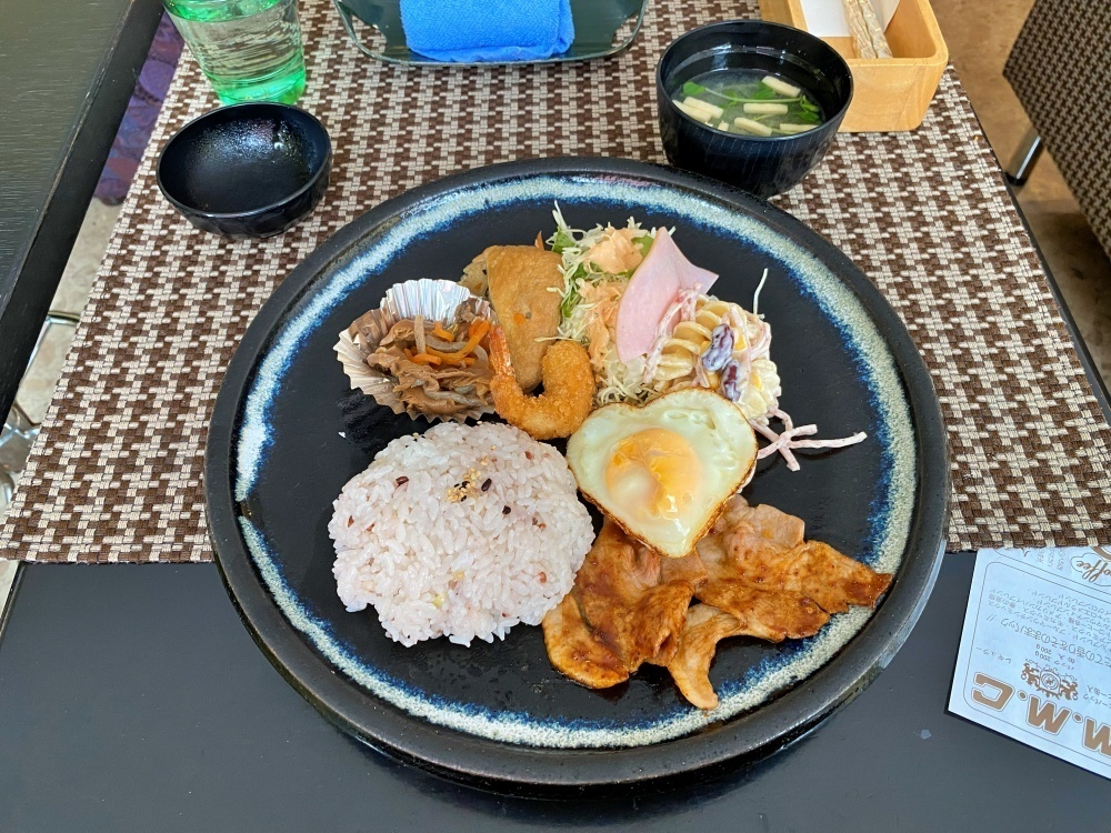 「プチセット」は、ワンプレートにごはんと豚肉、目玉焼き、エビフライなどのおかずとサラダが盛り付けられていました。